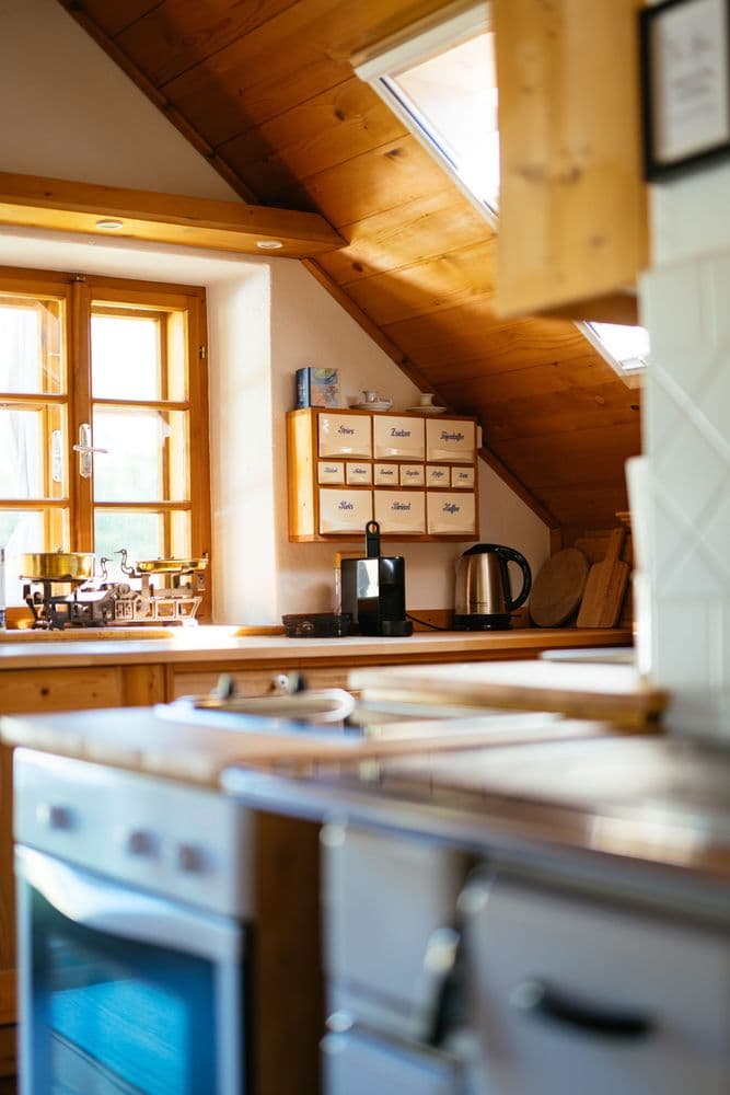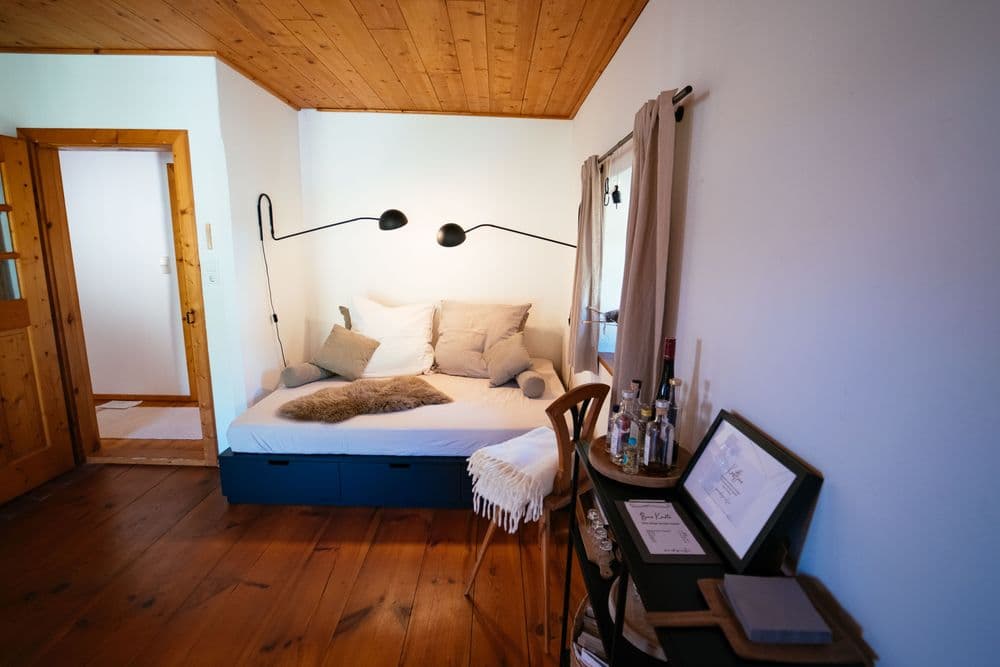 Dass die Unternehmerin den neu gefundenen Frieden in Aigen 13 mit Gästen und Freunden teilen wollte, lag quasi auf der Hand. „Der Hof hat drei separate Eingänge mitsamt Garten, sodass wir zwei Bereiche davon als Ferienwohnungen ausgebaut haben. Dort gibt es bewusst keine Fernseher. Bei uns steht die Zeit für sich selbst und mit seinen Nächsten im Vordergrund. Zudem gibt es bei uns in der Region so viel draußen zu erleben und zu unternehmen! Am Hof selbst warten schattige Rastplätze und unser hauseigener Gemüsegarten, wo sich alle bedienen dürfen. Wir haben für ganz viele Bücher zum Schmökern und Spiele in den Ferienwohnungen gesorgt. Ebenso finden unsere Gäste eine Kost- und Teebar sowie Stricksachen, wer sich in diesem Handwerk versuchen möchte.“ Ein gelungener Einrichtungsmix aus Alt und Neu ist Cornelia ein Anliegen, so wurde das Traditionelle am Hof bewahrt, jedoch mit einem Schwung Modernität und Komfort verfeinert. „Neben dem E-Herd hat der urige Holzofen nach wie vor seinen Platz. Auch die alten Böden sind geblieben. Dafür sind neue Boxspringbetten eingezogen und unsere Bettwäsche aus reinen Naturmaterialien. Für einen erholsamen Schlaf können unsere Gäste aus einem Polstermenü mit verschiedenen Kissen wählen, damit wirklich nichts die wertvolle Nachtruhe stört.“