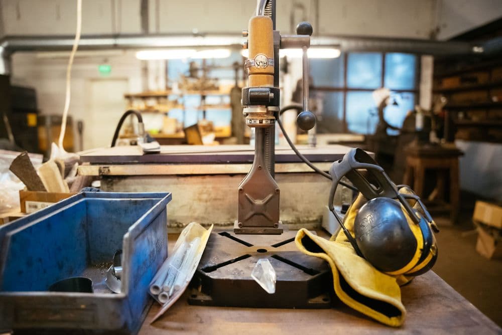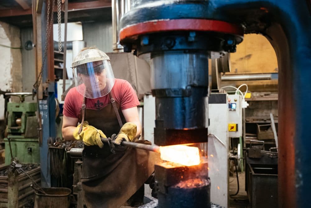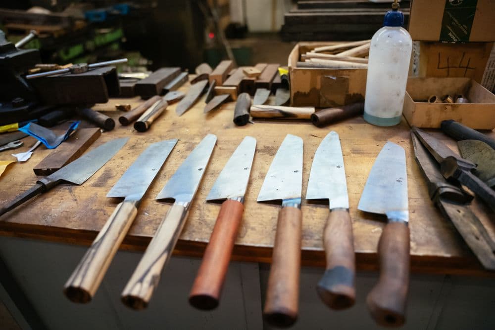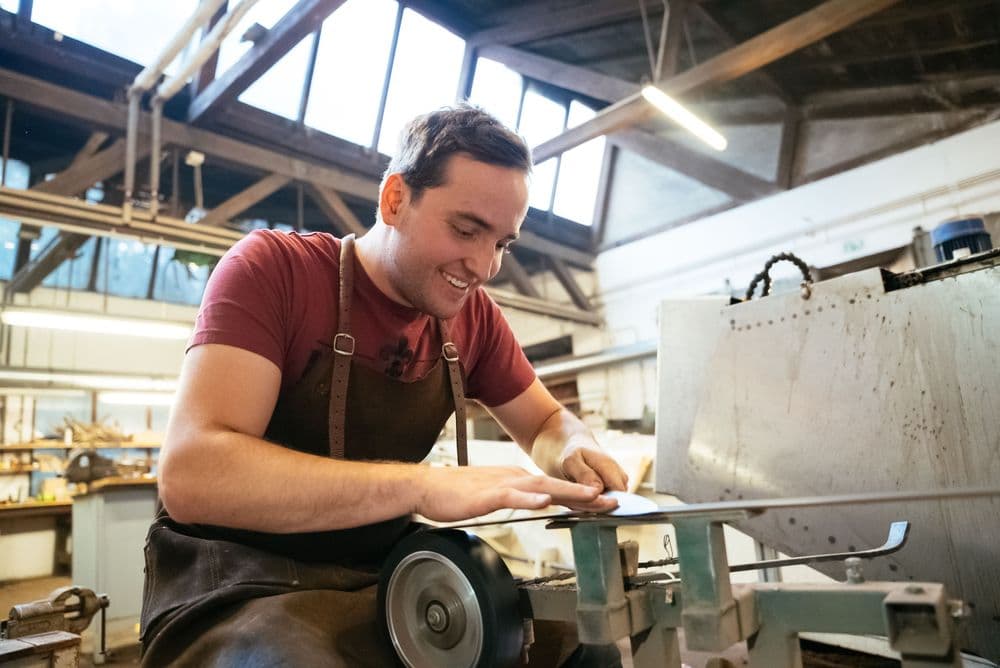 Zum Herstellen seiner Präzisionsmesser sind voller Körpereinsatz und Disziplin erforderlich: „Ein falscher Schliff und das Material ist unbrauchbar.“ Bis zum fertigen Produkt braucht es unzählige Arbeitsschritte. „Der Stahl wird direkt vom Werk geliefert, im Blechformat und nach der Güte, die ich im Vorfeld ausgesucht habe. Dieses wird zugeschnitten und in Boxen gepackt. Im Anschluss wird der Damast aus den verschiedenen Stählen zusammengesetzt, unter Hammer, Druck und Hitze zu neuem Material verschweißt. Durch die Fusion wachsen die unterschiedlichen Stähle dann ineinander. Davon werden wiederum einzelne Barren abgetrennt und in weiteren Arbeitsschritten zum Klingenrohling verarbeitet, der dann erneut gepresst wird und in die Schleiferei zur Fertigstellung kommt. Parallel dazu mache ich in der Holzwerkstatt den passende Griff dazu.“